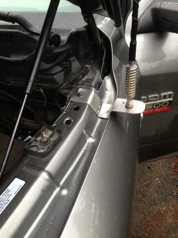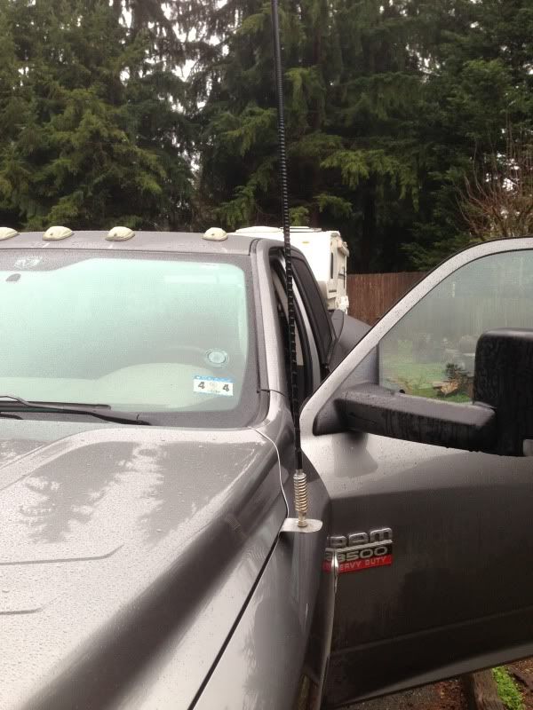 Getting the coax/ground from the antenna into the cab took a little effort. Just to be sure that I drilled in the right location, I pulled the mirror to get a closer look. I added a grommet and later sealed it up with some silicone just for good measure. As you can see in the picture, the mirror has quite a bit of structural support. I strongly suggest pulling the mirror before drilling just to make sure that you get it right.